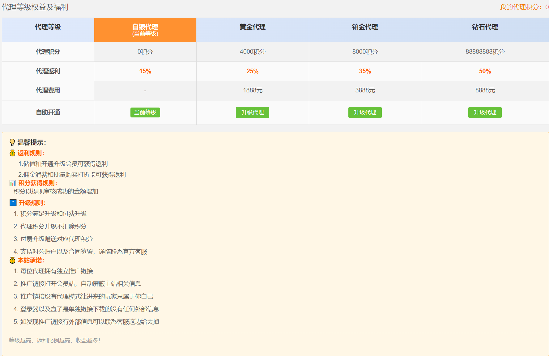 2.代理等级之间可以积分升级也支持购买升级
